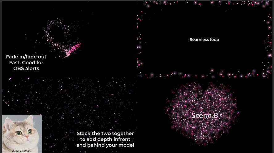 - Stardust and HeartFlow come with seamless loops and fade in/out versions. And those two plus Snow come with Webm and Webp versions for OBS and VTS